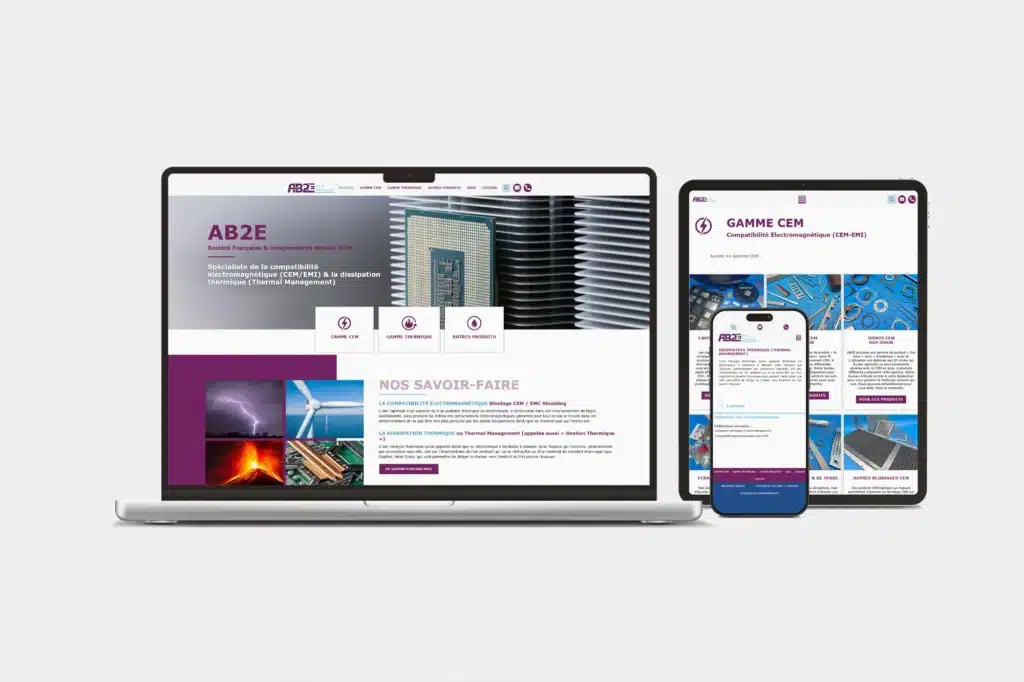 AB2E est une entreprise française indépendante, spécialisée depuis 2006 dans la compatibilité électromagnétique et la dissipation thermique, accompagnant des secteurs exigeants comme l’aéronautique, le médical, l’industrie et le militaire. AB2E a confié à Accentonic la création de son site internet dédié BtoB pour présenter ses nombreuses références produits régulièrement mises à jour.