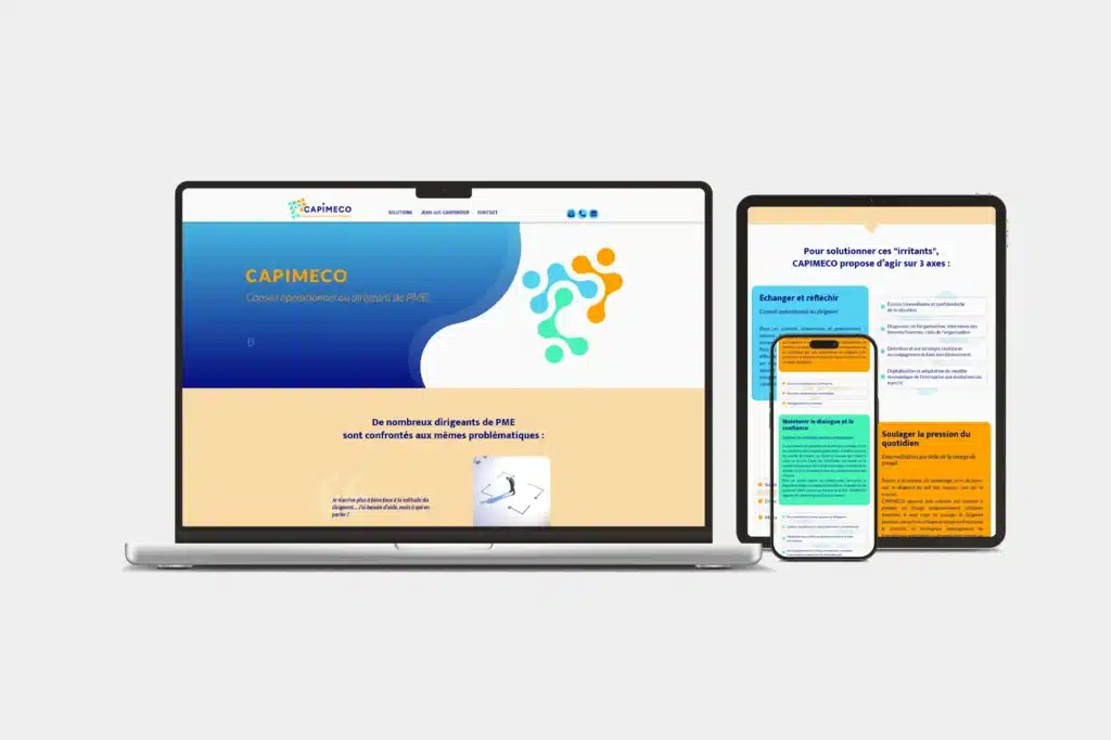 CAPIMECO est un cabinet de conseil opérationnel au service des dirigeants de PME : externalisation de la charge de travail, gestion des relations sociales, accompagnement en stratégie, RH, commercial… Capimeco a confié à Accentonic la création de son identité visuelle et numérique.